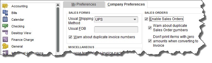 But if you plan to use sales orders, you must first make sure QuickBooks is set up to accommodate them. Open the Edit menu and select Preferences, then Sales & Customers. Click the Company Preferences tab to open that window.