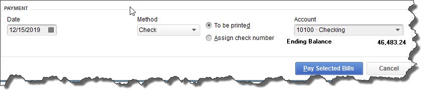 Once you’ve recorded a bill in Enter Bills, you need to visit the Pay Bills screen to dispatch a check. The image above shows the bottom of that screen.